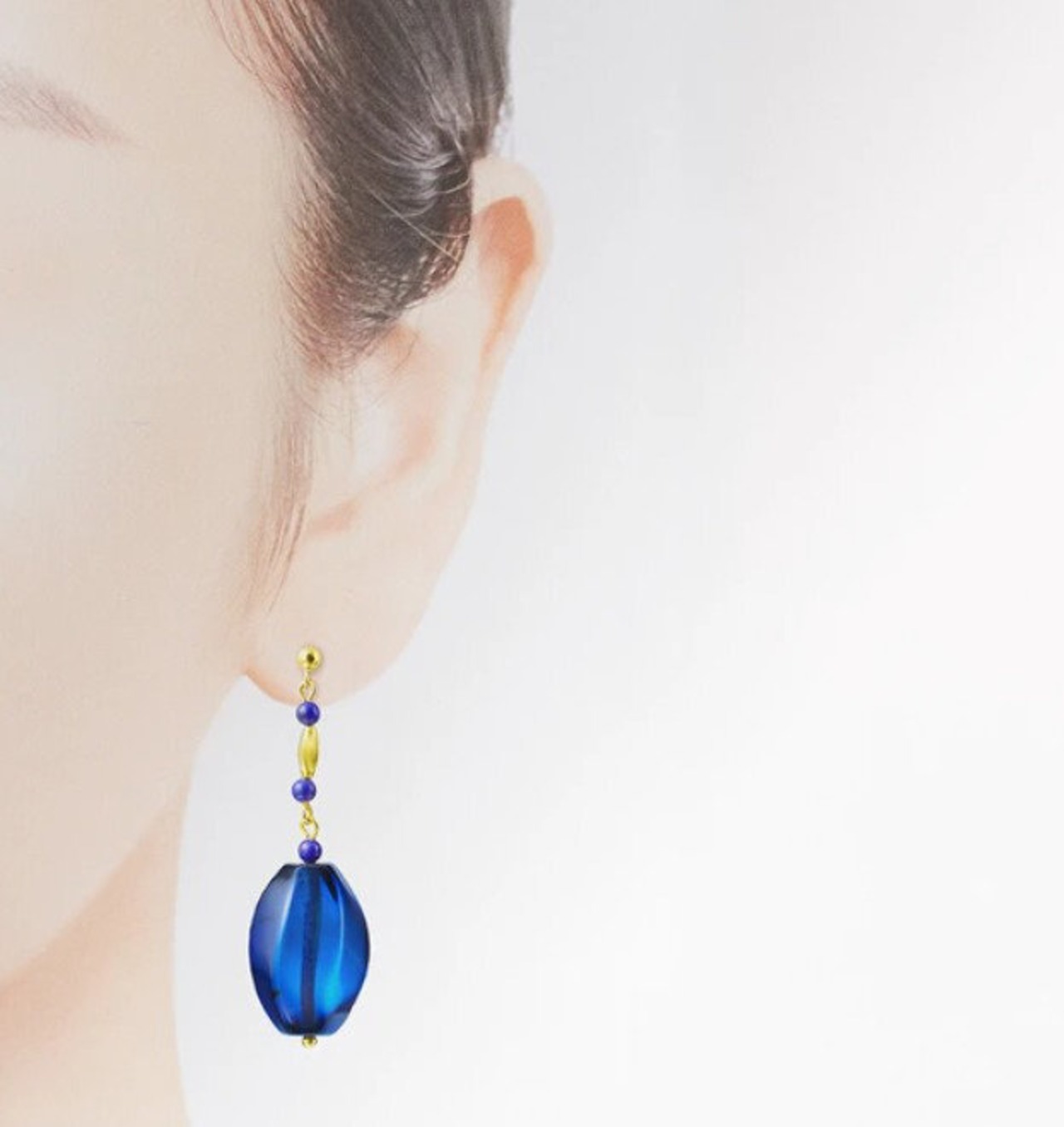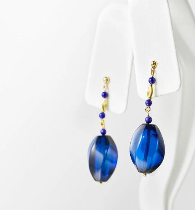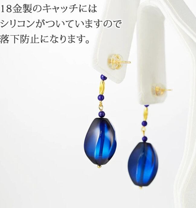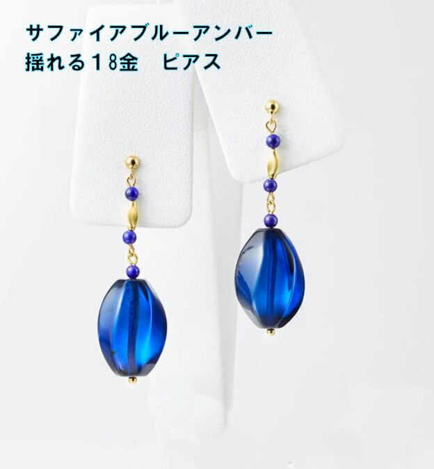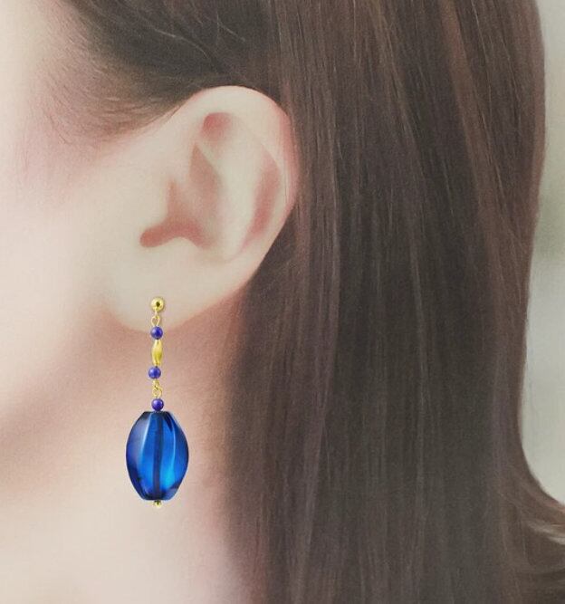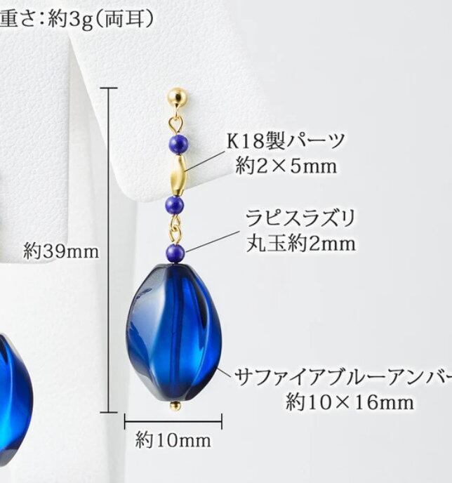 群青色が美しいサファイアブルーアンバーと人気のラピスラズリを合わせたピアスです。