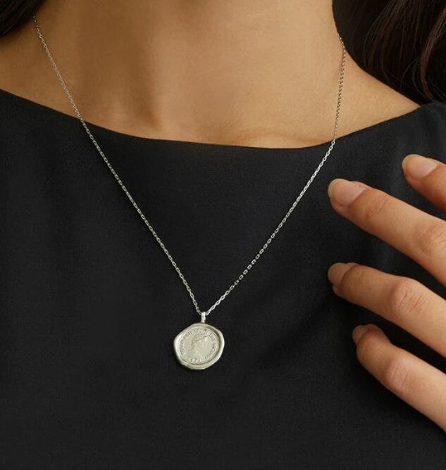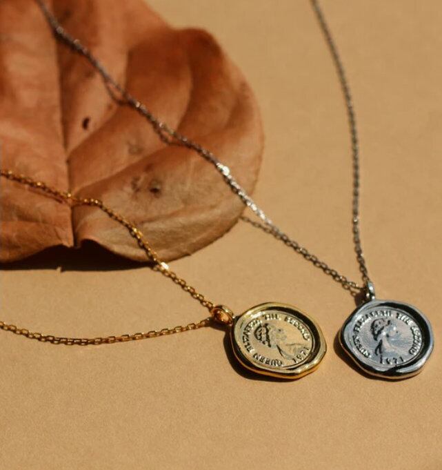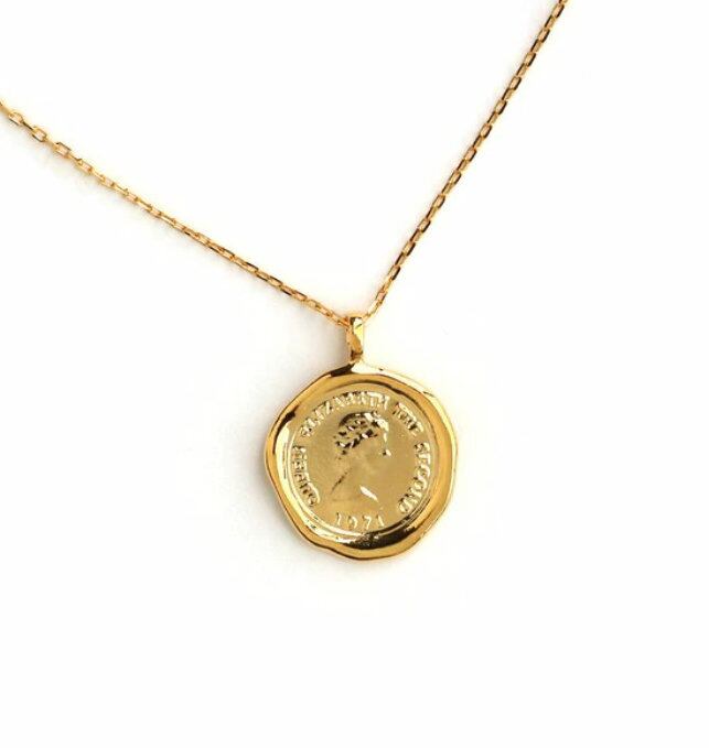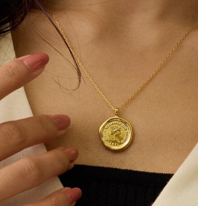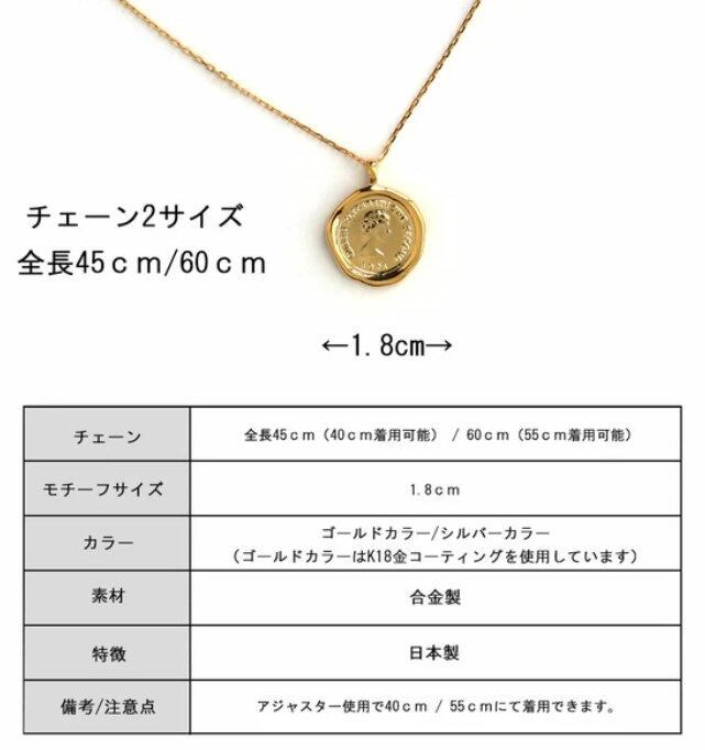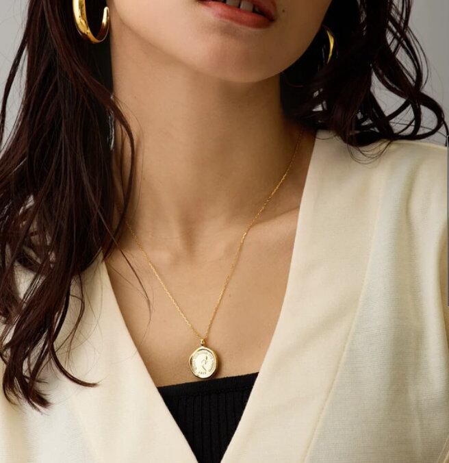 Melody Accessory の K18 コイン ゆがみ 幸運 ペンダント は、フォルムが優美な輝きを放つ、シーリングスタンプ風のコインネックレスです。このシンプルなコインモチーフは、どんなコーデにも取り入れやすく、上品なアクセントとして活躍します。また、程良い長さで存在感があり、大人のデコルテにぴったりです。このネックレスは、金属アレルギーを引き起こす原因の「ニッケル」を含まないように製造されており、お肌に優しく安心してご利用いただけます。