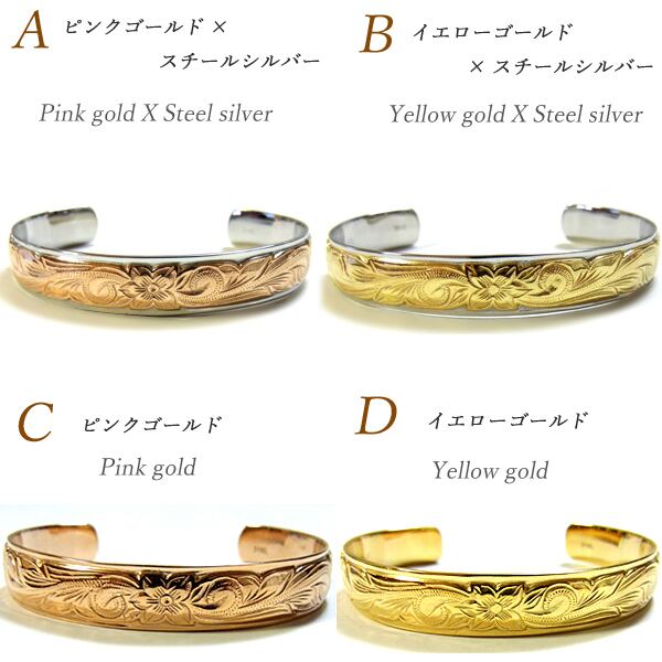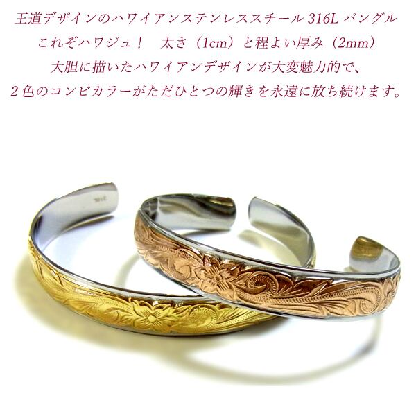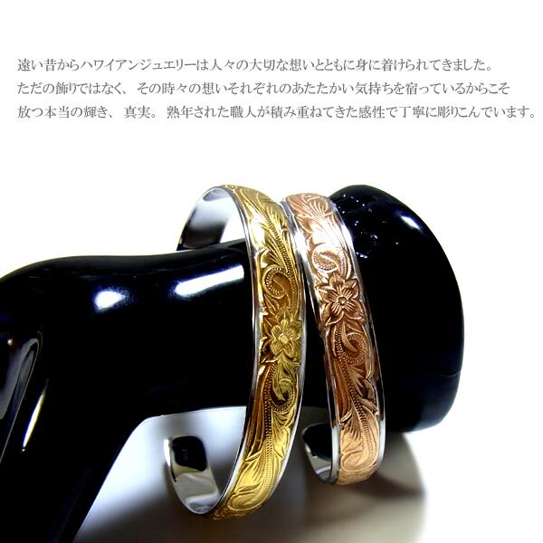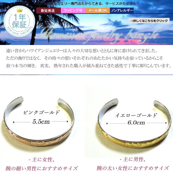 商品ポイント ハワイでは愛する人から想いを込めてハワイアンジュエリーを贈る習慣があります★遠い昔からハワイアンジュエリーは人々の大切な想いとともに身に着けられてきました。 使用貴金属 ステンレススチール316L/PVDイエロー・ピンクゴールド 総重量 16g サイズ 幅:1.0cm 腕サイズ ピンクゴールド5.5cm(主に女性、腕の細い男性におすすめサイズ) イエローゴールド6.0cm(主に男性、腕の太い女性におすすめサイズ) ステンレススチール 当店のステンレスは、医療用品にも使われているサージカルステンレス316Lです。変色もせず・傷・汚れにも強く、アレルギーを起こしづらい安心な素材です。 半永久的な輝きを演出します!