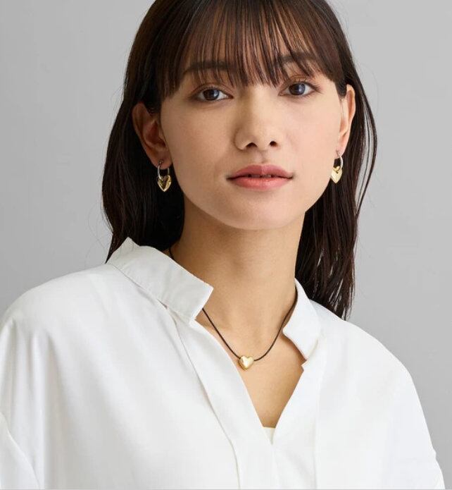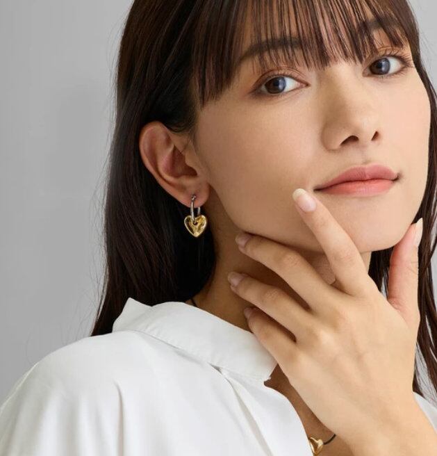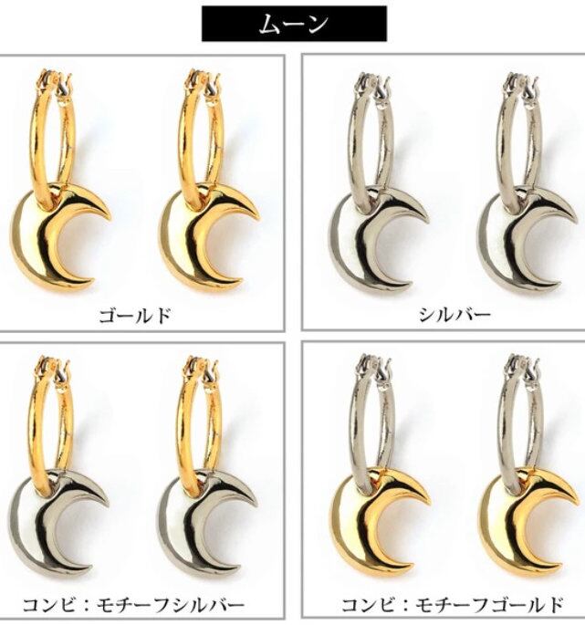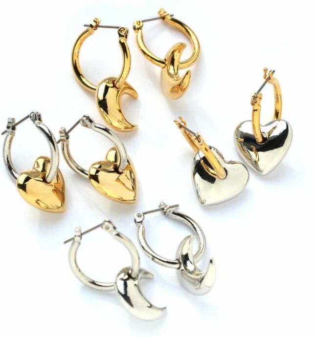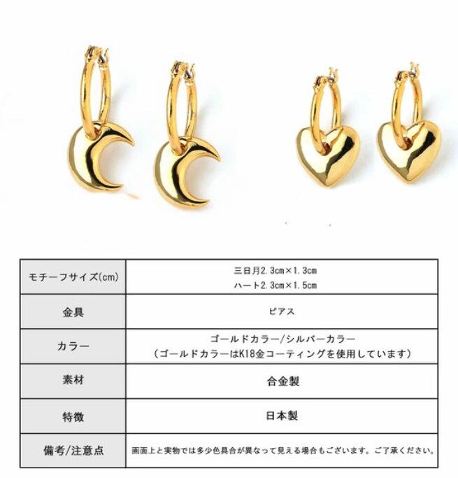 フープピアスにぷっくりとした艶やかなハートやムーンモチーフを合わせたキャッチレスピアス。