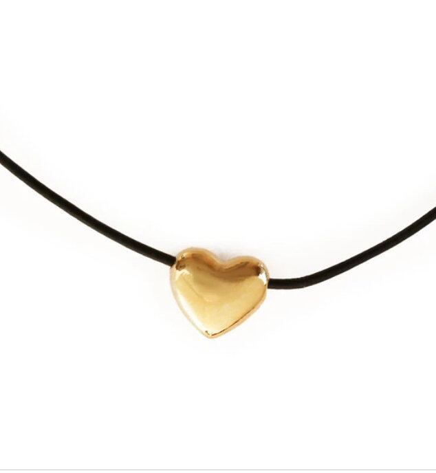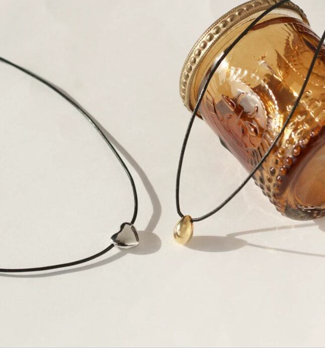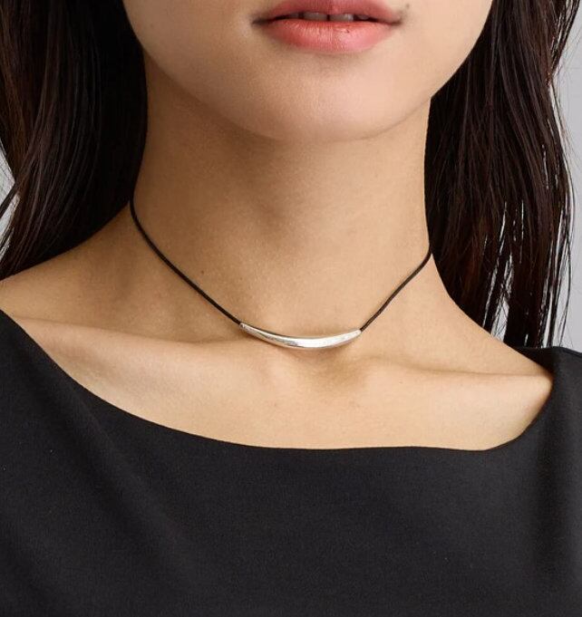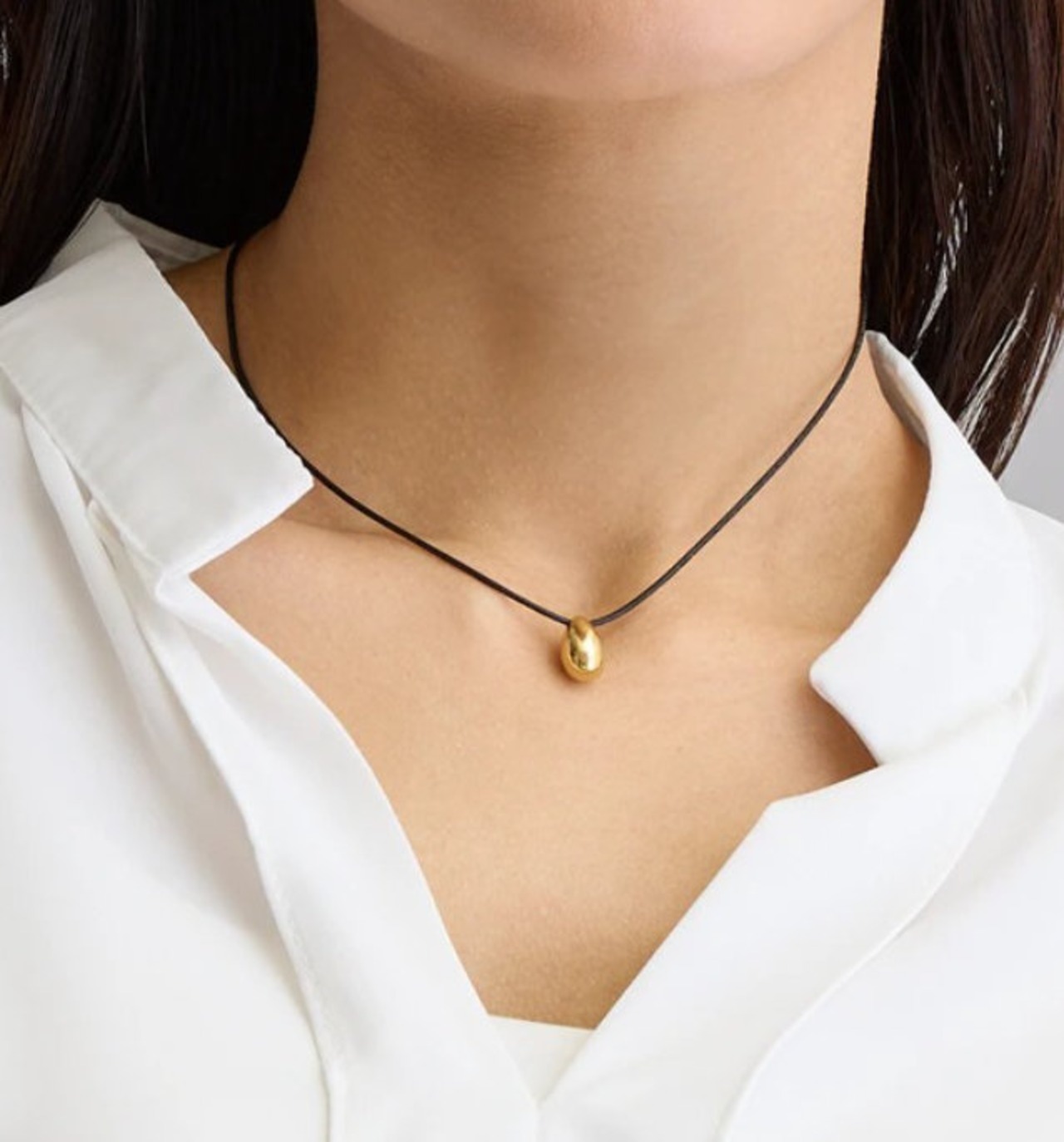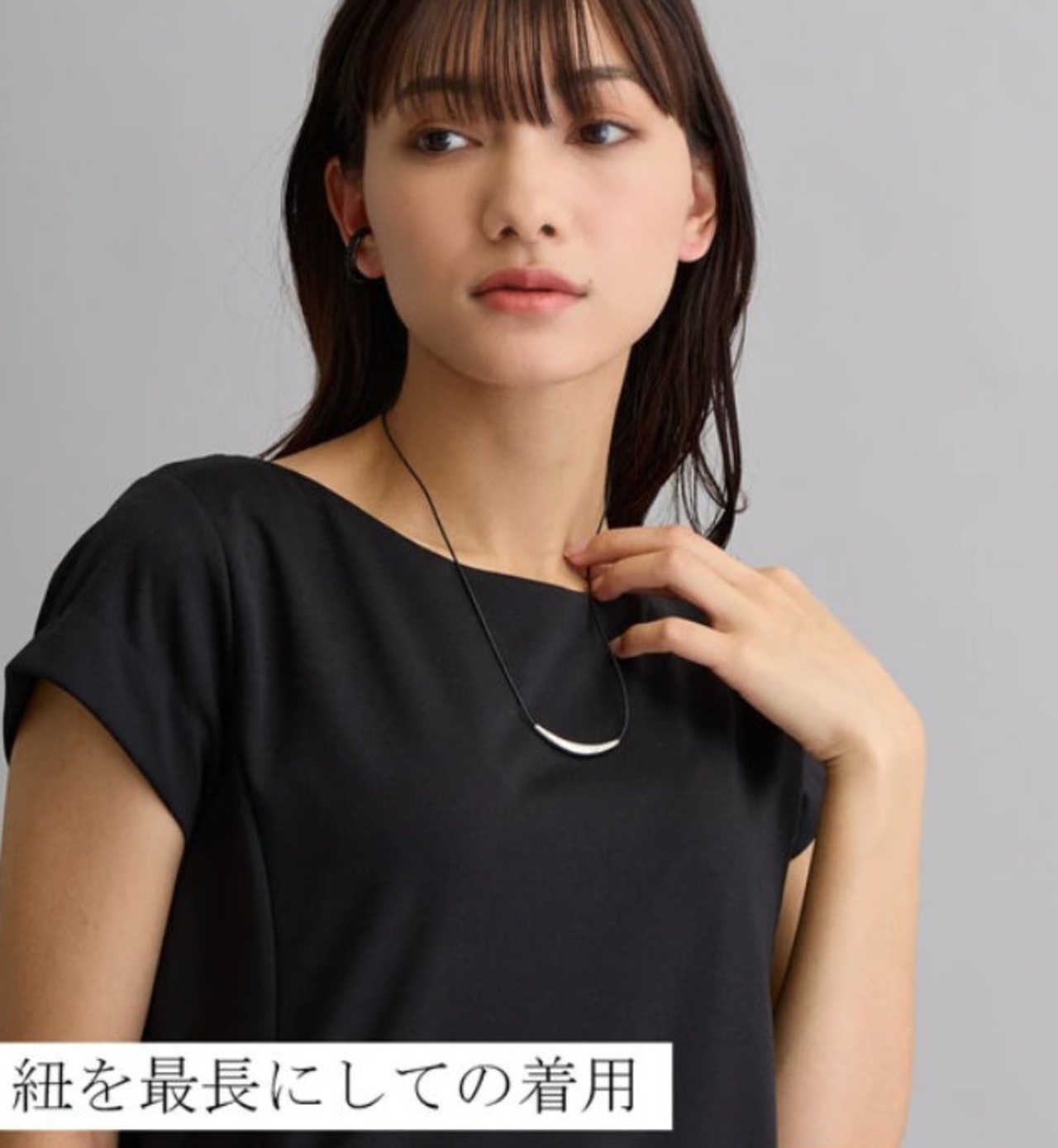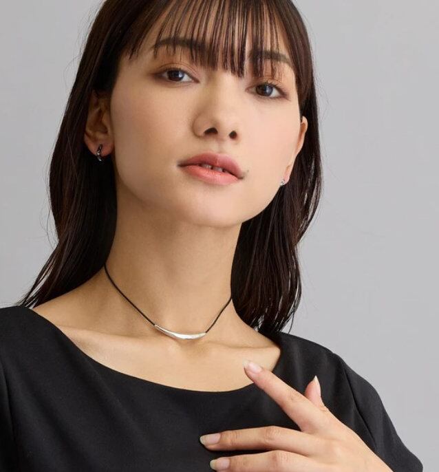 本革のブラックコードが締まりのあるデコルテラインを演出。