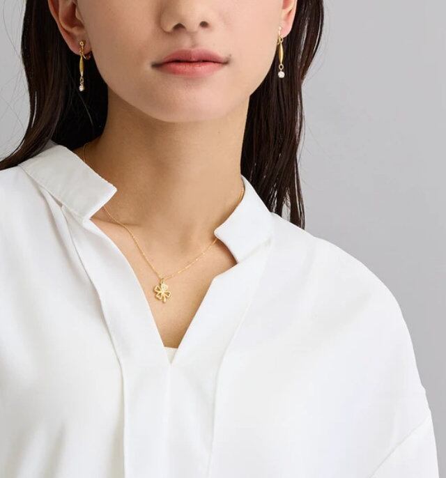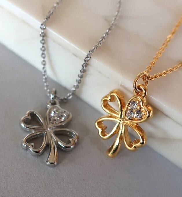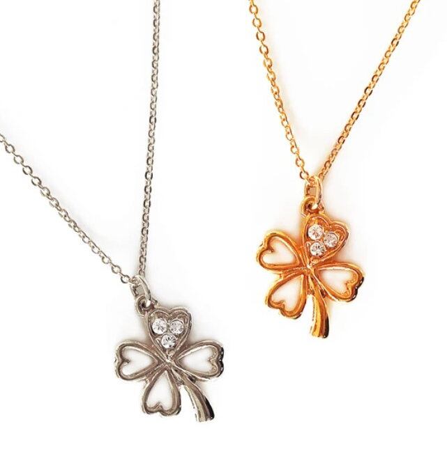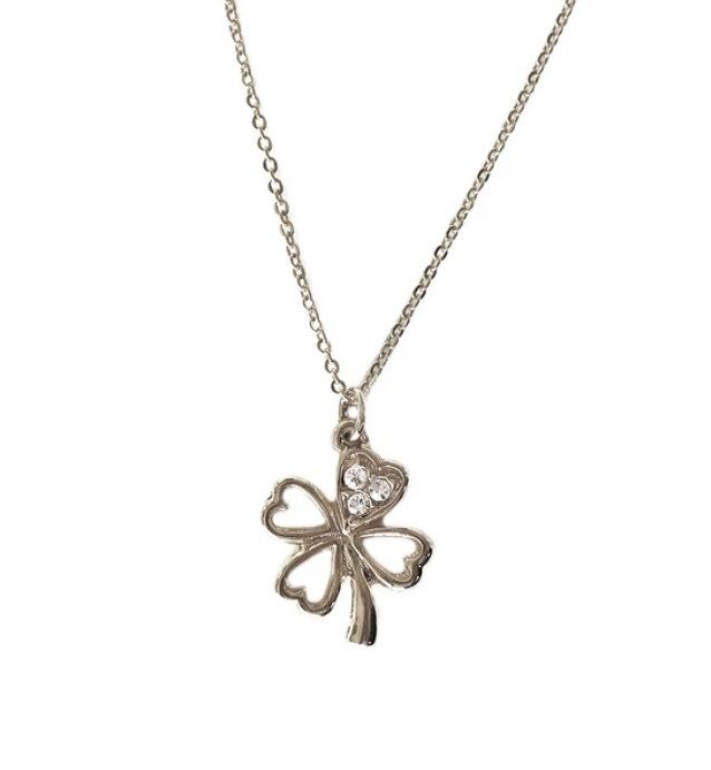 キラリと輝きを放つ3粒のラインストーンが可愛らしいクローバーモチーフのネックレスです。